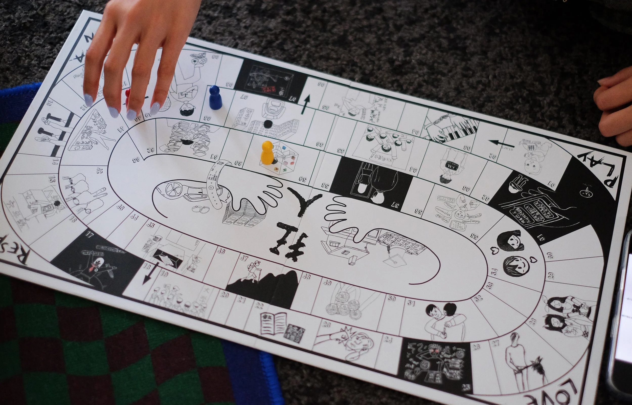 SHU SHU has developed *Madman*, a board game for children and adolescents, as an extension of *Re-reading Lu Xun* (Issue 4 of POD zine, currently in production). As a socially engaged board game, *Madman* draws inspiration from the traditional "goose game," transforming its path of fate into a map of real-life growth. The game board features 31 illustrated spaces that reflect the real experiences and struggles contemporary youth may face while growing up.